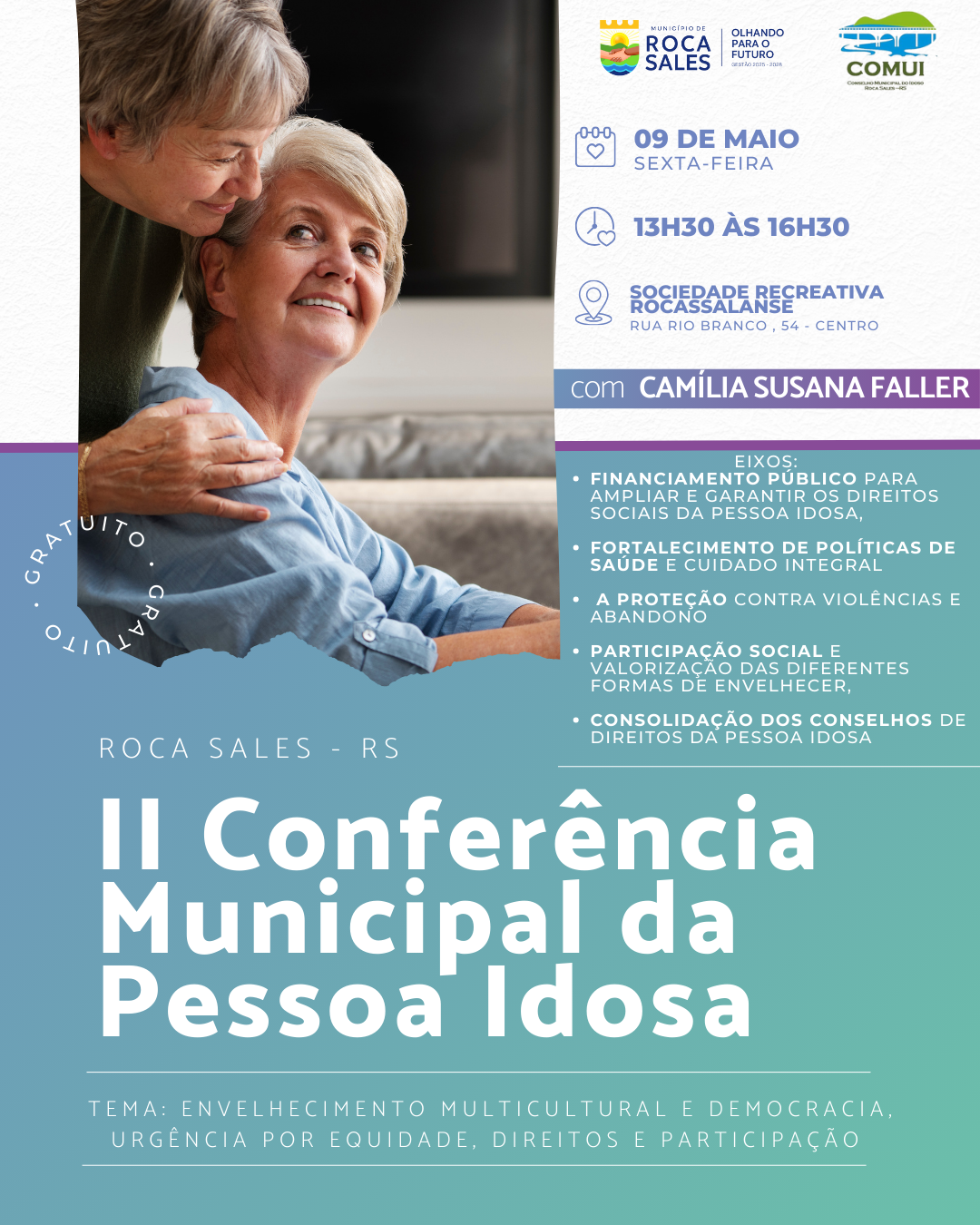 A conferência contará com a presença da advogada e assistente social Camília Susana Faller, que conduzirá a palestra magna, trazendo reflexões sobre os desafios e avanços nas políticas públicas voltadas à população idosa.
