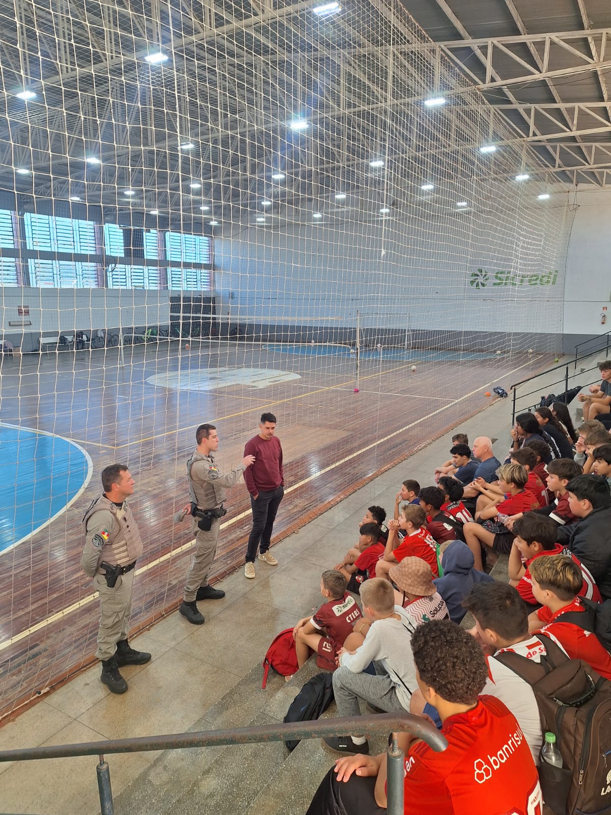A conversa foi conduzida pelo Capitão Caneppele, o Tenente Friedrich e soldados da corporação, com foco principal na prevenção de assaltos e orientações de segurança no dia a dia dos adolescentes. A presença dos militares trouxe não apenas informações técnicas, mas também exemplos e reflexões sobre atitudes seguras e conscientes dentro e fora dos ambientes esportivos.