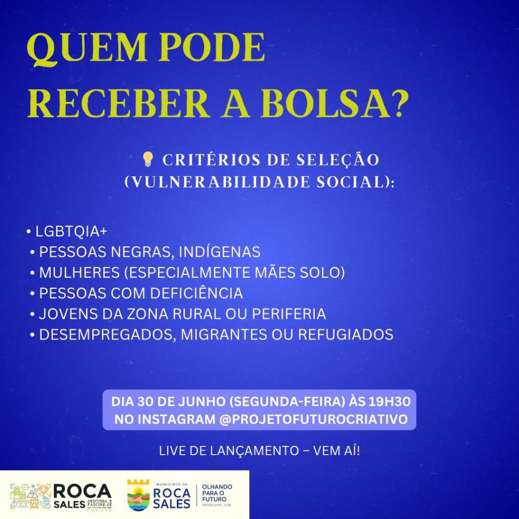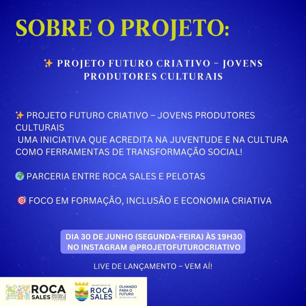 O município de Roca Sales foi selecionado para participar do Projeto Futuro Criativo – Jovens Produtores Culturais, uma iniciativa que visa fortalecer a produção artística e cultural entre jovens e educadores(as), promovendo a inclusão social, a diversidade e a valorização da economia criativa como caminhos de desenvolvimento humano e comunitário.