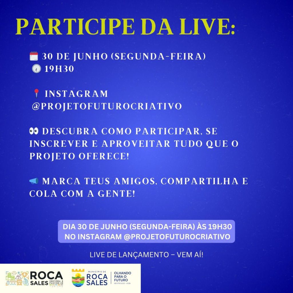 Como primeira ação oficial, será realizada uma live de lançamento do Projeto Futuro Criativo no dia 30 de junho (segunda-feira), às 19h30, com transmissão pelo Instagram do projeto: @projetofuturocriativo.