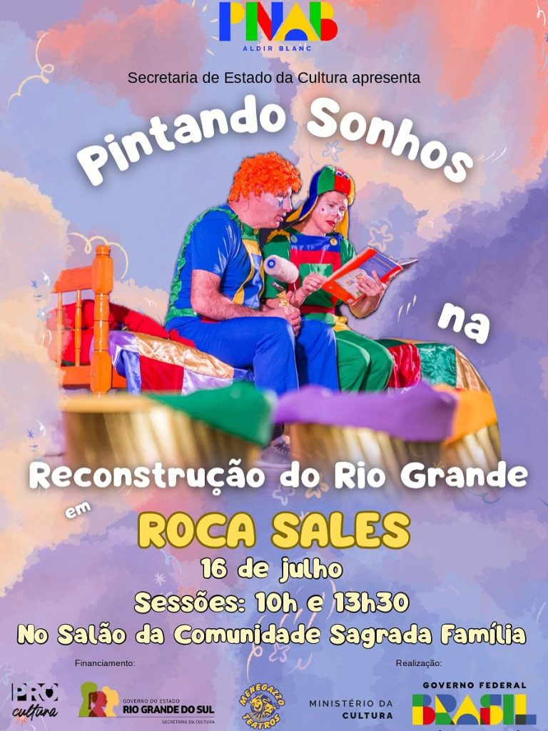 No próximo dia 16 de julho, o município de Roca Sales receberá duas sessões do espetáculo teatral infantil “Pintores de Sonhos”, às 10h e às 13h30, no Salão da Comunidade Sagrada Família. As apresentações integram o Projeto Cultural “Pintando Sonhos na Reconstrução do Rio Grande”, aprovado no Edital nº 26/2024 da SEDAC / PNAB / RS, promovido pela Menegazzo Teatros.