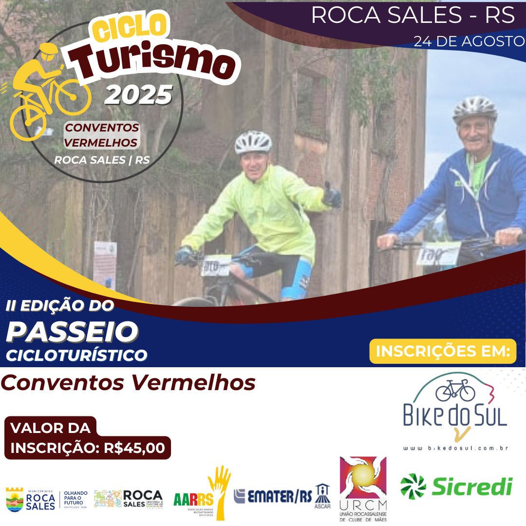 A Prefeitura Municipal de Roca Sales, por meio do Departamento de Esportes e do Departamento de Cultura e Turismo, com apoio de grupos de ciclismo locais, convida a todos para participar do II Passeio Cicloturístico Conventos Vermelhos, no dia 24 de agosto de 2025 (domingo), das 06h30 às 14h30.