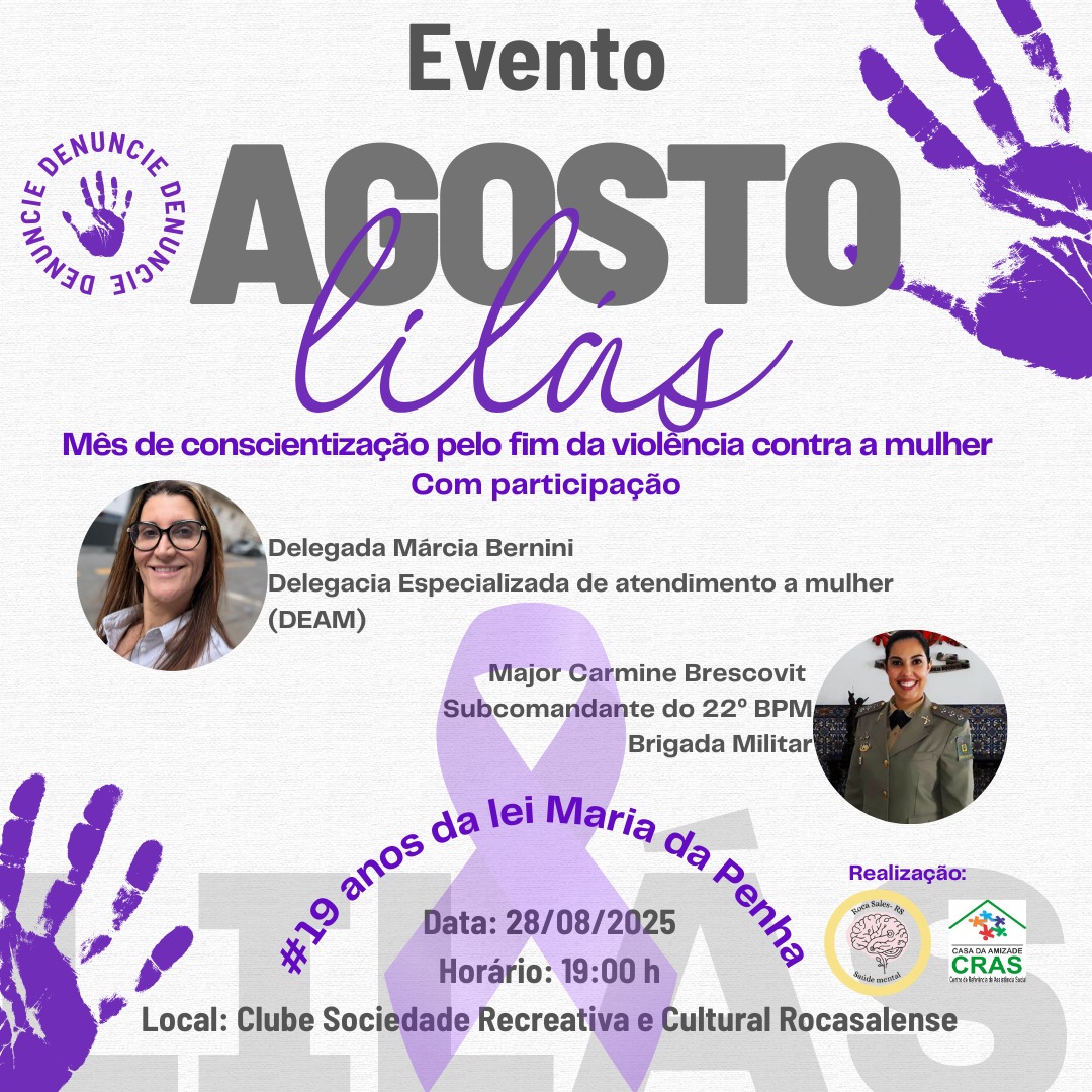 No próximo dia 28 de agosto de 2025, Roca Sales será palco de um importante momento de conscientização e diálogo sobre a violência contra a mulher. Em alusão ao Agosto Lilás, mês dedicado à mobilização social pelo fim da violência de gênero, será realizado um evento no Clube Sociedade Recreativa e Cultural Rocasalense, a partir das 19h.