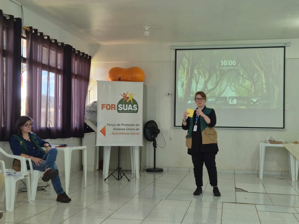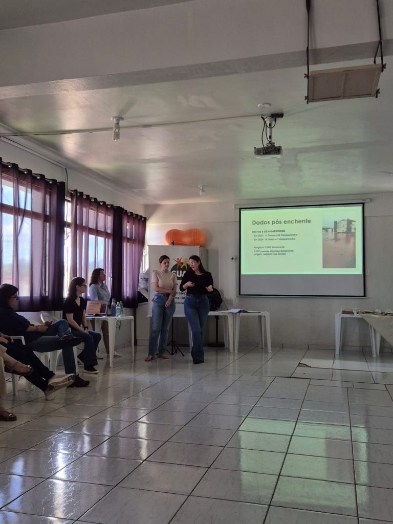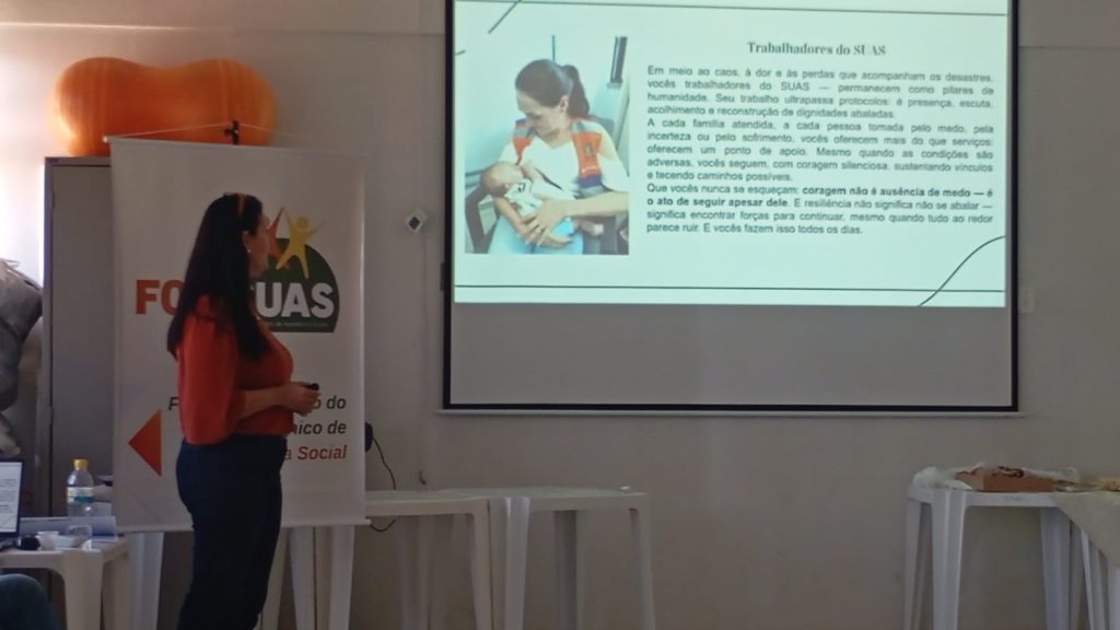 A assistente social Graziela Sinara Gheno Lorenzi apresentou os trabalhos realizados, reforçando o compromisso do SUAS com a proteção social e o atendimento às famílias atingidas.