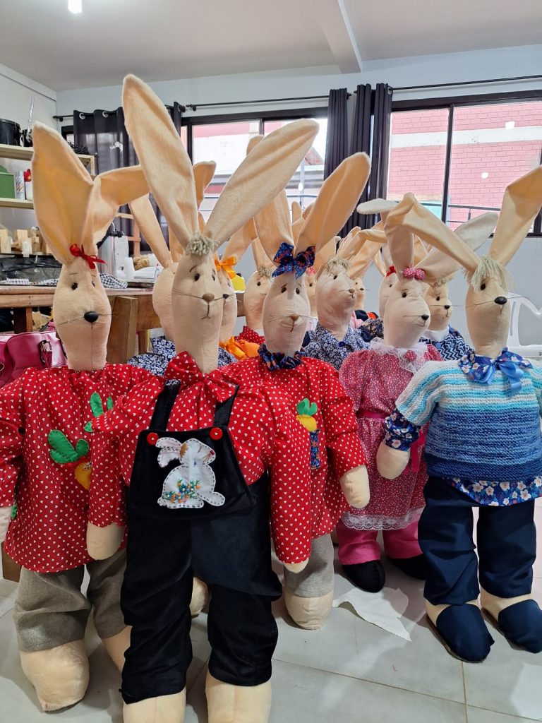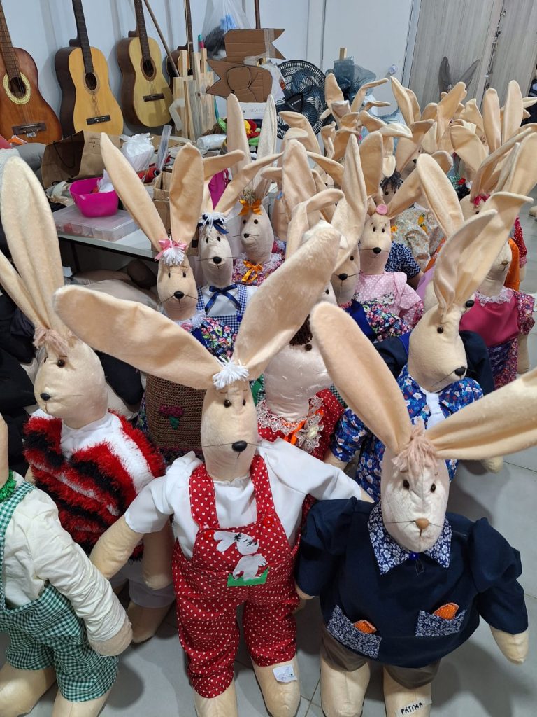 A meta inicial era confeccionar ao menos 60 coelhos decorativos. Com empenho, dedicação e espírito de união, 50 unidades já estão prontas e lindamente finalizadas. Cada peça foi produzida individualmente por uma participante, que utilizou suas habilidades em costura, tricô, crochê, bordado e aplicação de adornos. O resultado é fruto de uma verdadeira força-tarefa marcada por criatividade e solidariedade.