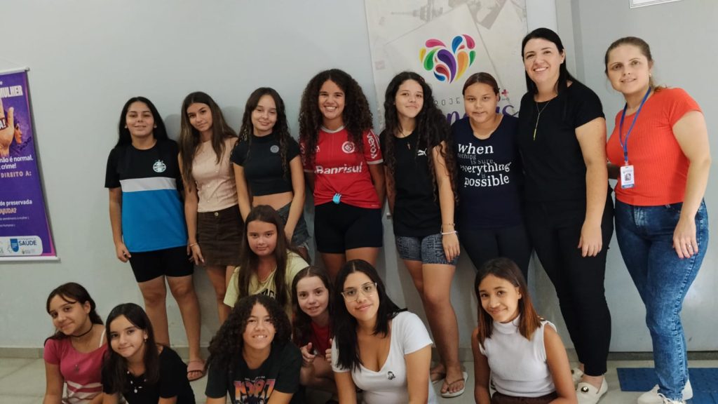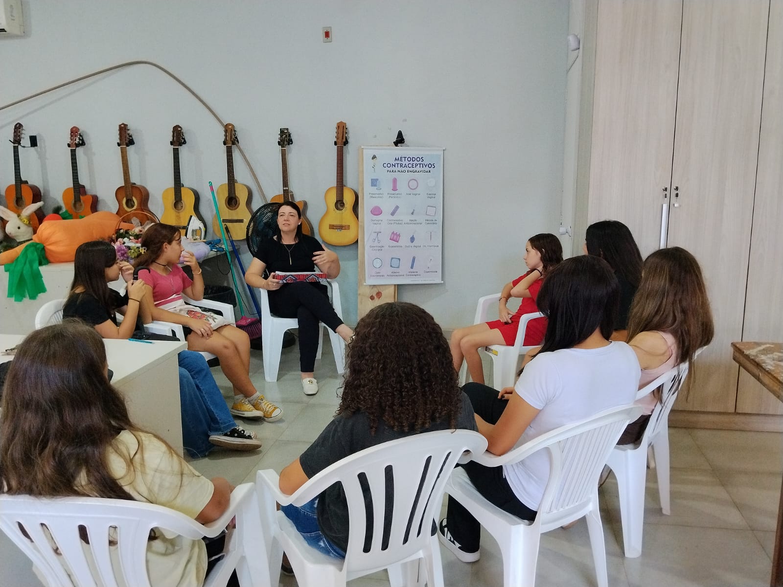 Durante o encontro, Carina conduziu um momento de conversa e orientação com as adolescentes, abordando temas fundamentais como prevenção à saúde, sexualidade, métodos contraceptivos e imunizações. A atividade teve como objetivo promover a conscientização, além de esclarecer dúvidas e fortalecer o acesso à informação de forma clara e acolhedora.